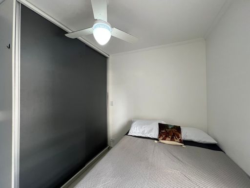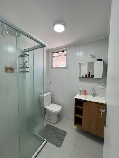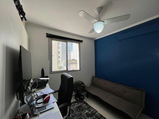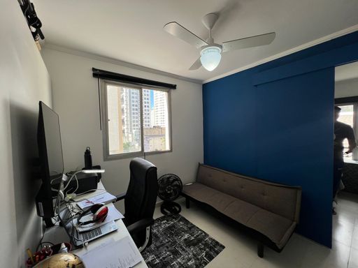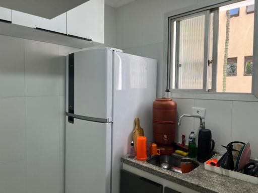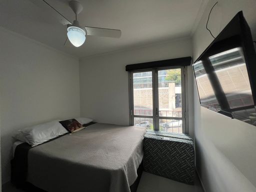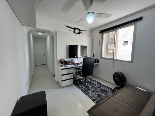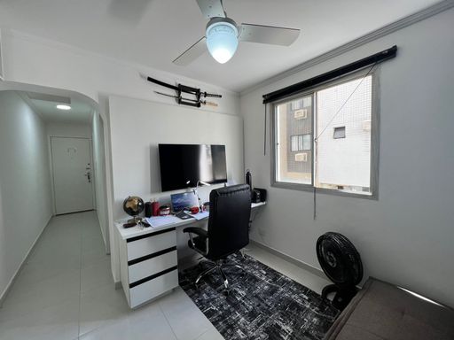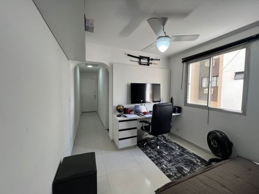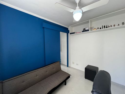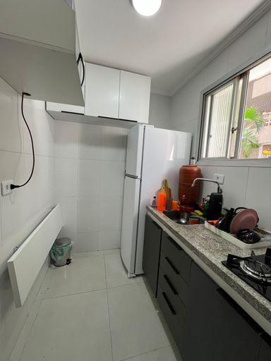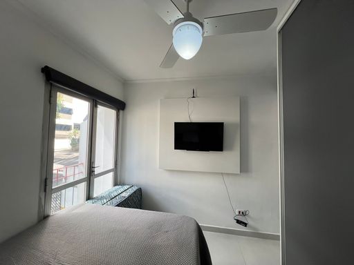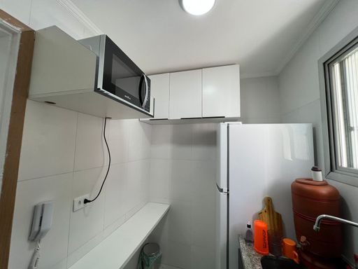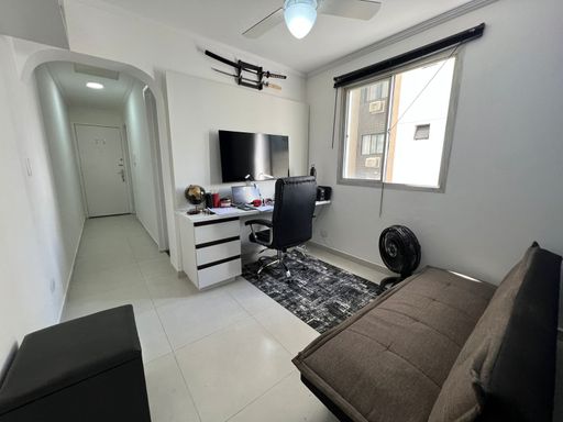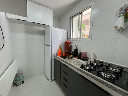 Apartamento reformado com cozinha, banheiro, sala e quarto.